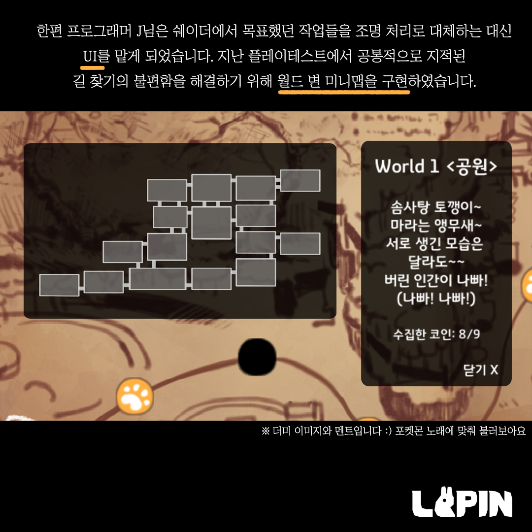프로그래머 J님은 쉐이더에서 원래 목표했던 작업들을 조명 처리로 대체하는 대신 UI를 맡게 되었습니다. 지난 플레이테스트에서 공통적으로 지적된 길 찾기의 불편함을 해결하기 위해 월드 별 미니맵을 구현하였습니다.