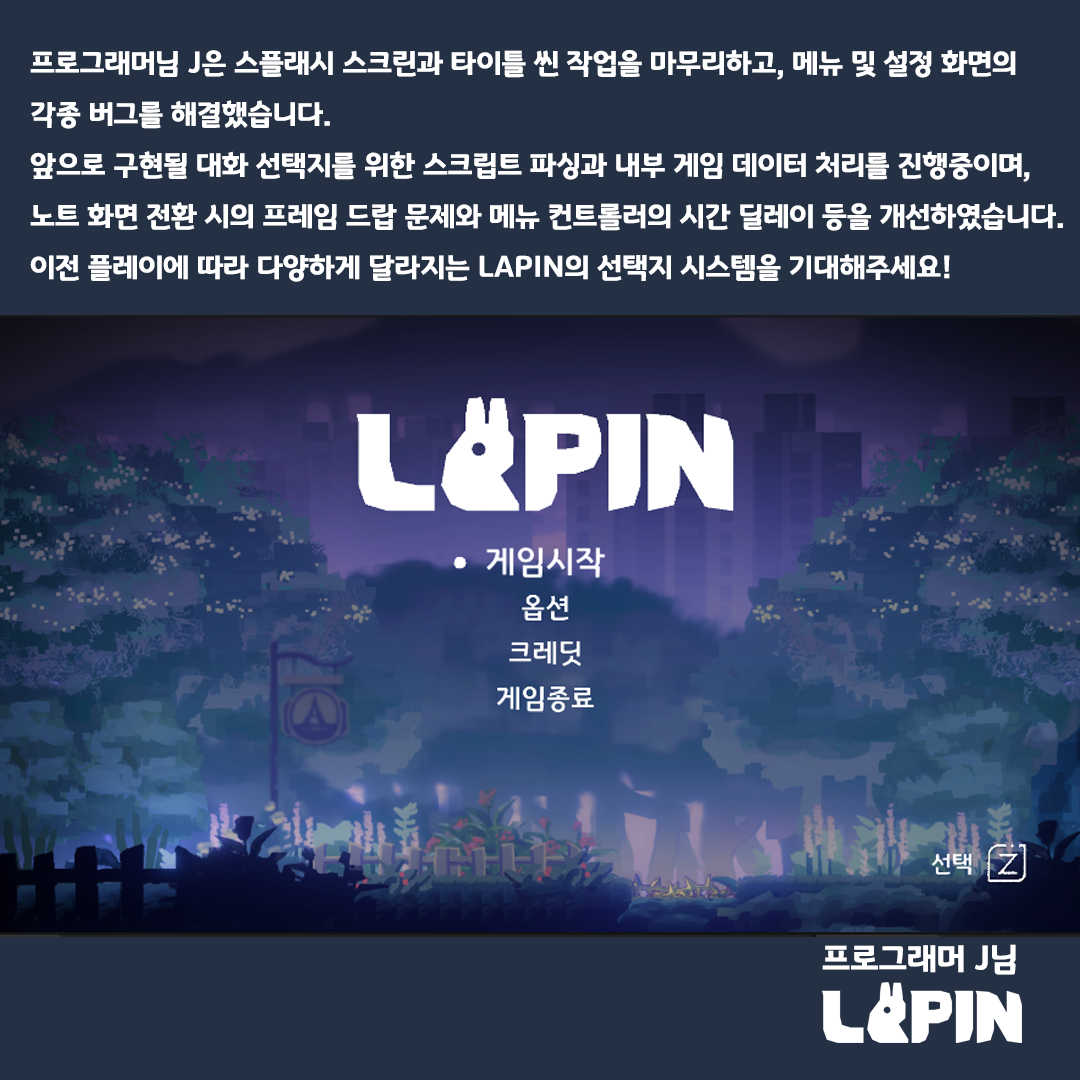 프로그래머 J님은 타이틀 씬 작업을 마무리하고, 스플래시 스크린을 추가했습니다. 타이틀 화면의 애니메이션을 수정&보완하였고 GameData에 플레이 시간/저장 시작 데이터를 추가했습니다. 선택지 파싱 구현을 진행하고 있으며, UI Camera의 사용법을 파악하고 관련 버그를 수정하였습니다. 앞으로 구현될 LAPIN의 선택지 시스템을 기대해 주세요!