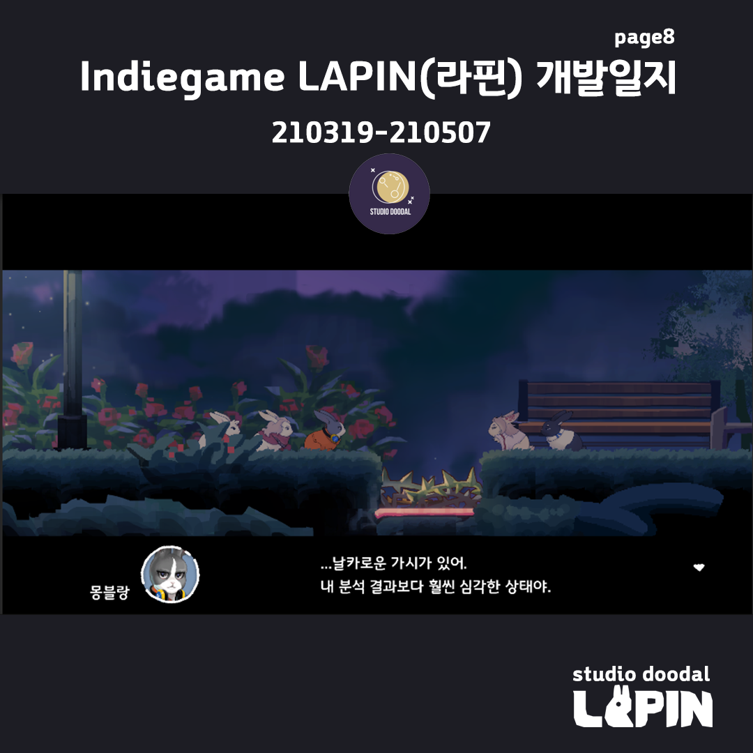 아트 G님은 기존 아파트 형태의 알파 기획이 토끼굴 형태로 변화하며, 알파의 배경과 플랫폼을 다시 꾸몄습니다. 알파의 기획이 변화하며 엘리베이터도 나무 엘리베이터로 변화하였답니다. 변화한 플랫폼에 맞게 토끼들의 가구를 다시 배치하고, 지하실로 향하는 통로의 발판을 제작하고 알파 플랫폼에 새겨진 긴급 SOS UI등을 제작했습니다. chapter1의 추가 루트 플랫폼을 꾸미고, 대화 중 선택지 UI와 '리베 노트' 페이지 등을 바뀐 기획에 따라 재디자인 했습니다. 또한 타이틀 임시 이미지를 제작하고, chapter1끝에서 등장하는 컷씬 연출을 위해 스토리보드 러프를 영상화했습니다.
