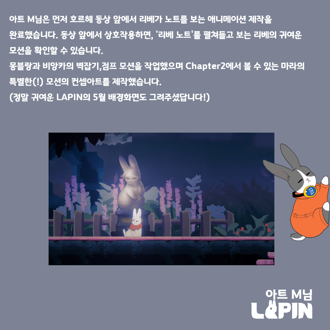 아트 M님은 먼저 호르헤 동상 앞에서 리베가 노트를 보는 애니메이션 제작을 완료했습니다. 동상 앞에서 상호작용하면, '리베 노트'를 펼쳐들고 보는 리베의 귀여운 모션을 확인할 수 있습니다. 몽블랑과 비앙카의 벽잡기,점프 모션을 작업했으며 Chapter2에서 볼 수 있는 마라의 특별한(!) 모션의 컨셉아트를 제작했습니다. (정말 귀여운 LAPIN의 5월 배경화면도 그려주셨답니다!)