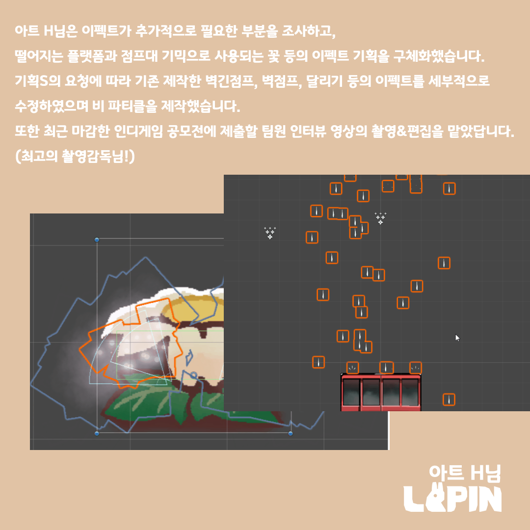 아트 H님은 이펙트가 추가적으로 필요한 부분을 조사하고, 떨어지는 플랫폼과 점프대 기믹으로 사용되는 꽃 등의 이펙트 기획을 구체화했습니다. 기획S의 요청에 따라 기존 제작한 벽긴점프, 벽점프, 달리기 등의 이펙트를 세부적으로 수정하였으며 비 파티클을 제작했습니다. 또한 최근 마감한 인디게임 공모전에 제출할 팀원 인터뷰 영상의 촬영&편집을 맡았답니다. (최고의 촬영감독님!)